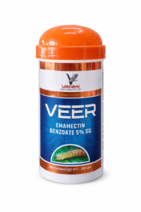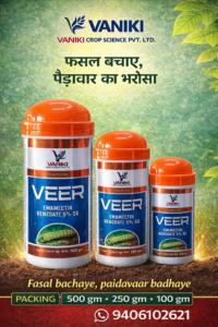 यह उत्पाद VEER Insecticide है, जिसे VANIKI Crop Science Pvt. Ltd. द्वारा निर्मित किया गया है। इसमें Emamectin Benzoate 5% SG सक्रिय तत्व होता है, जो फसलों में लगने वाली इल्ली एवं पत्ती खाने वाले कीटों के नियंत्रण में अत्यंत प्रभावी माना जाता है। यह कीटनाशक कीटों की स्नायु प्रणाली पर असर डालकर उन्हें नष्ट करता है, जिससे फसल को सुरक्षित रखता है। VEER का उपयोग कपास, सब्ज़ी एवं अन्य फसलों में कीट प्रकोप को कम करने में सहायक होता है और बेहतर गुणवत्ता व उत्पादन प्राप्त करने में मदद करता है। उचित मात्रा एवं कृषि विशेषज्ञ की सलाह अनुसार उपयोग करने पर यह किसानों के लिए लाभदायक सिद्ध होता है।