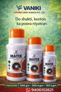 यह उत्पाद MATIX Insecticide है, जिसे VANIKI Crop Science Pvt. Ltd. द्वारा निर्मित किया गया है। इसमें Dinotefuran 15% + Pymetrozine 45% WG का शक्तिशाली संयोजन होता है, जो फसलों में लगने वाले चूसक कीटों जैसे माहू, जेसिड, सफ़ेद मक्खी आदि के नियंत्रण में अत्यंत प्रभावी माना जाता है। यह कीटनाशक कीटों की भोजन प्रक्रिया को बाधित करता है, जिससे उनका प्रभावी ढंग से नाश होता है। MATIX फसल को लंबे समय तक सुरक्षा प्रदान करता है और पौधों की स्वस्थ वृद्धि व बेहतर उत्पादन में सहायक होता है। उचित मात्रा एवं कृषि विशेषज्ञ की सलाह अनुसार उपयोग करने पर यह किसानों के लिए लाभकारी सिद्ध होता है।