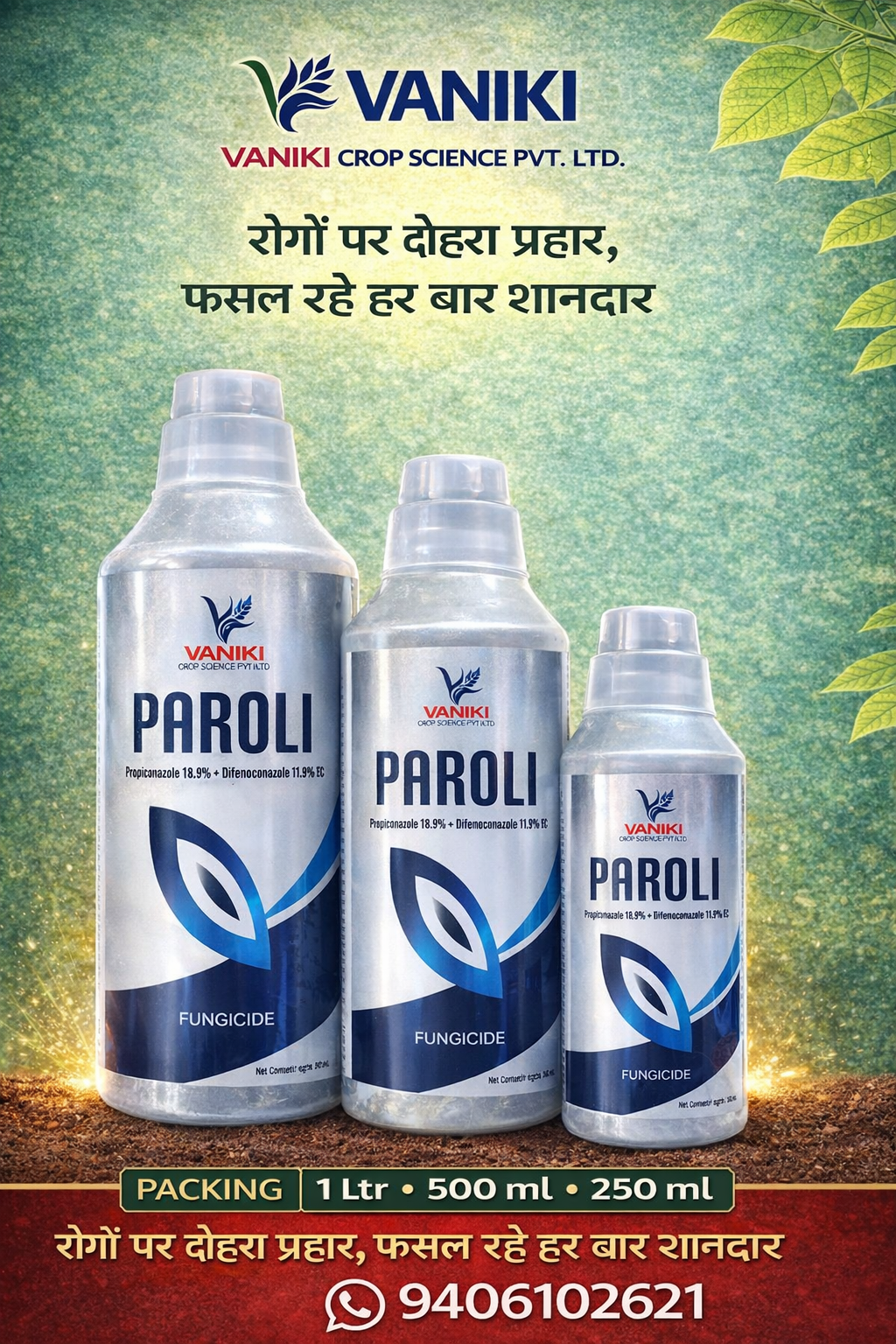 यह उत्पाद PAROLI Fungicide है, जिसे VANIKI Crop Science Pvt. Ltd. द्वारा निर्मित किया गया है। इसमें Propiconazole 18.9% + Difenoconazole 11.9% EC का प्रभावी संयोजन होता है, जो फसलों में लगने वाले विभिन्न फफूंद जनित रोगों के नियंत्रण में अत्यंत कारगर माना जाता है। यह दवा झुलसा, पत्ती धब्बा, रतुआ एवं अन्य फंगल रोगों पर प्रभावी नियंत्रण प्रदान करती है। PAROLI पौधों के भीतर तक जाकर रोग के प्रसार को रोकता है, जिससे फसल स्वस्थ रहती है और उत्पादन में सुधार होता है। उचित मात्रा एवं कृषि विशेषज्ञ की सलाह अनुसार उपयोग करने पर यह किसानों के लिए लाभकारी सिद्ध होता है।